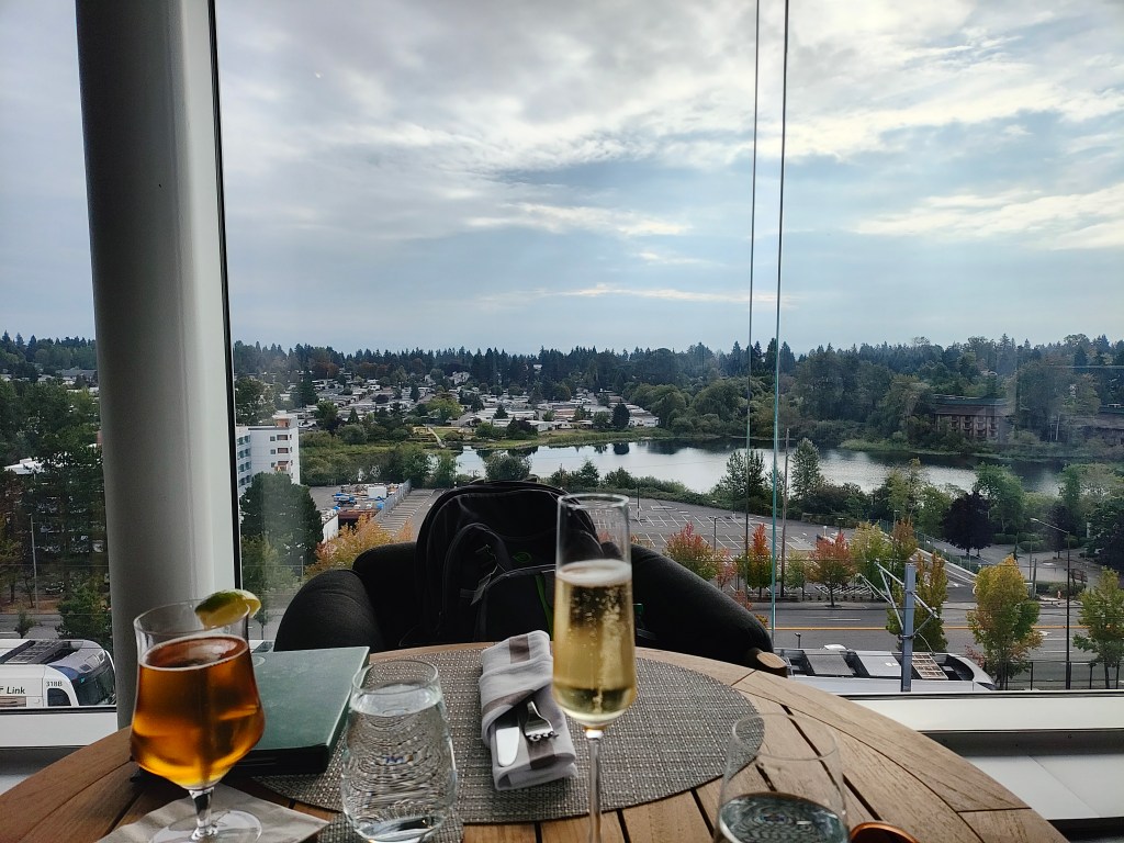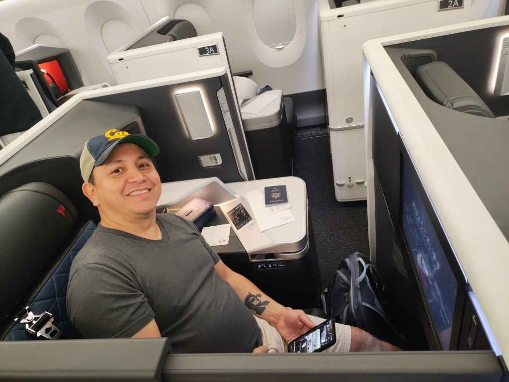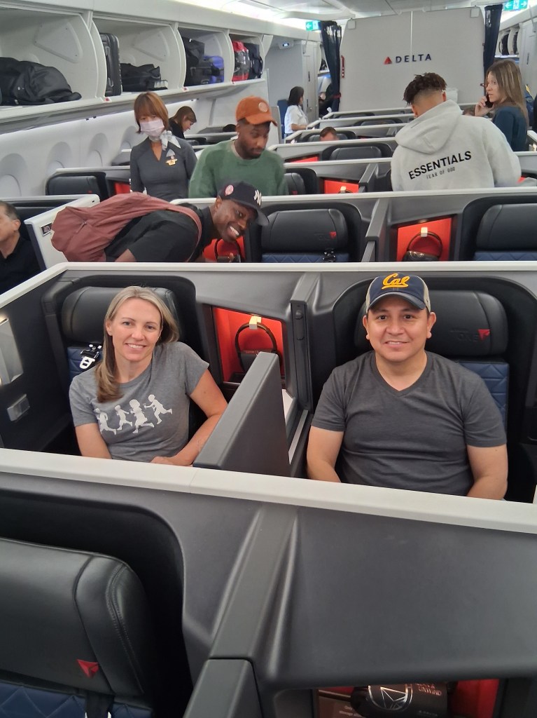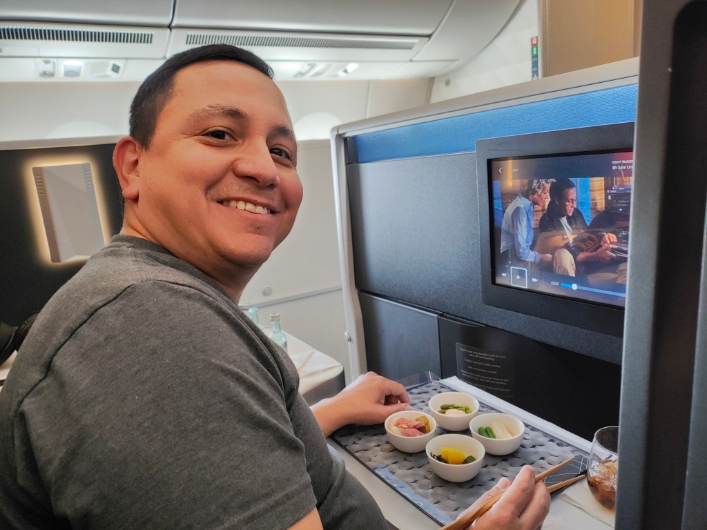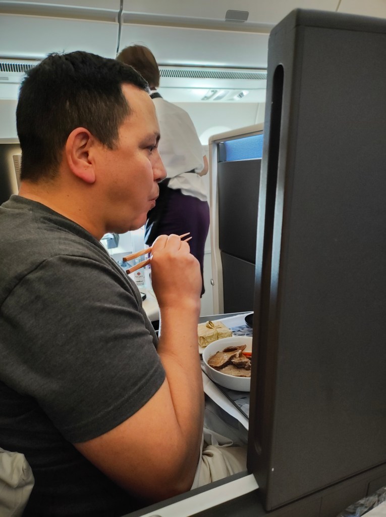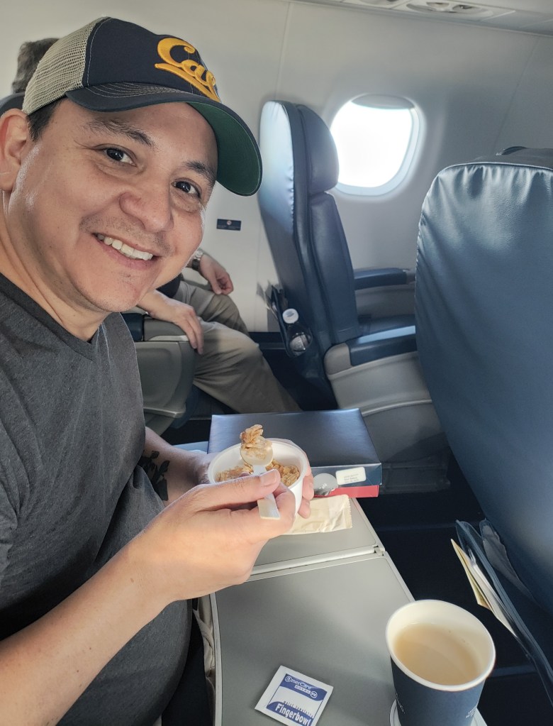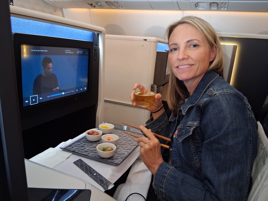 Tues, Sept 9 – Day 2 – First Class & Delta One Class – Bob and Norma drove us to the airport EARLY to catch our 5 am flight. In domestic First Class, Bobby kept it real by enjoying cereal (Special K) with a mimosa for breakfast. During our layover in Seattle, we visited the newly-opened Delta One Lounge. It was quite swanky. [It’s advertised as “an exclusive airport lounge for Delta One business class passengers and eligible Delta 360 members offering a premium, private experience with amenities like full-service dining, spa treatments, shower suites, and attentive service.”] After breakfast and a beverage, we headed over to our gate. Boarding international Delta One Class is basically like having your own cubicle, with a door, and a bed, on a plane. We ate, drank, watched movies [Jaws – it still totally holds up], and slept in (mostly) comfort on our way to Japan.