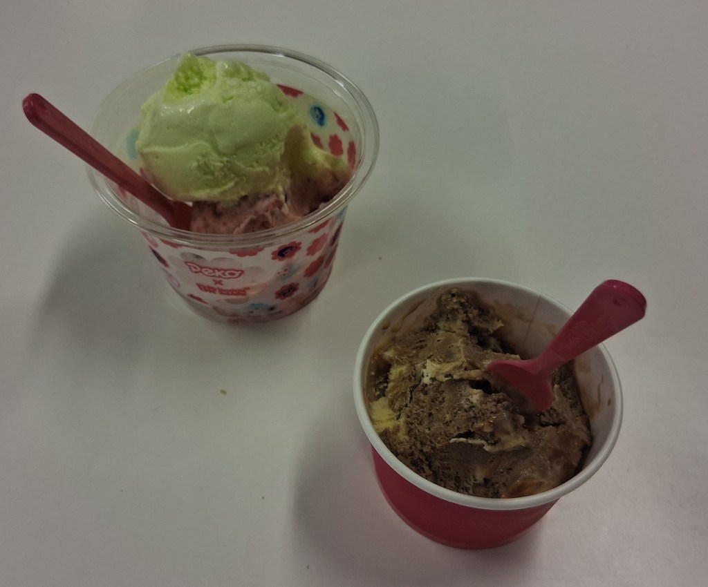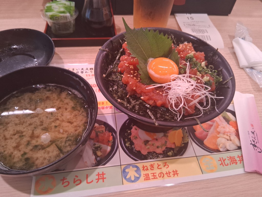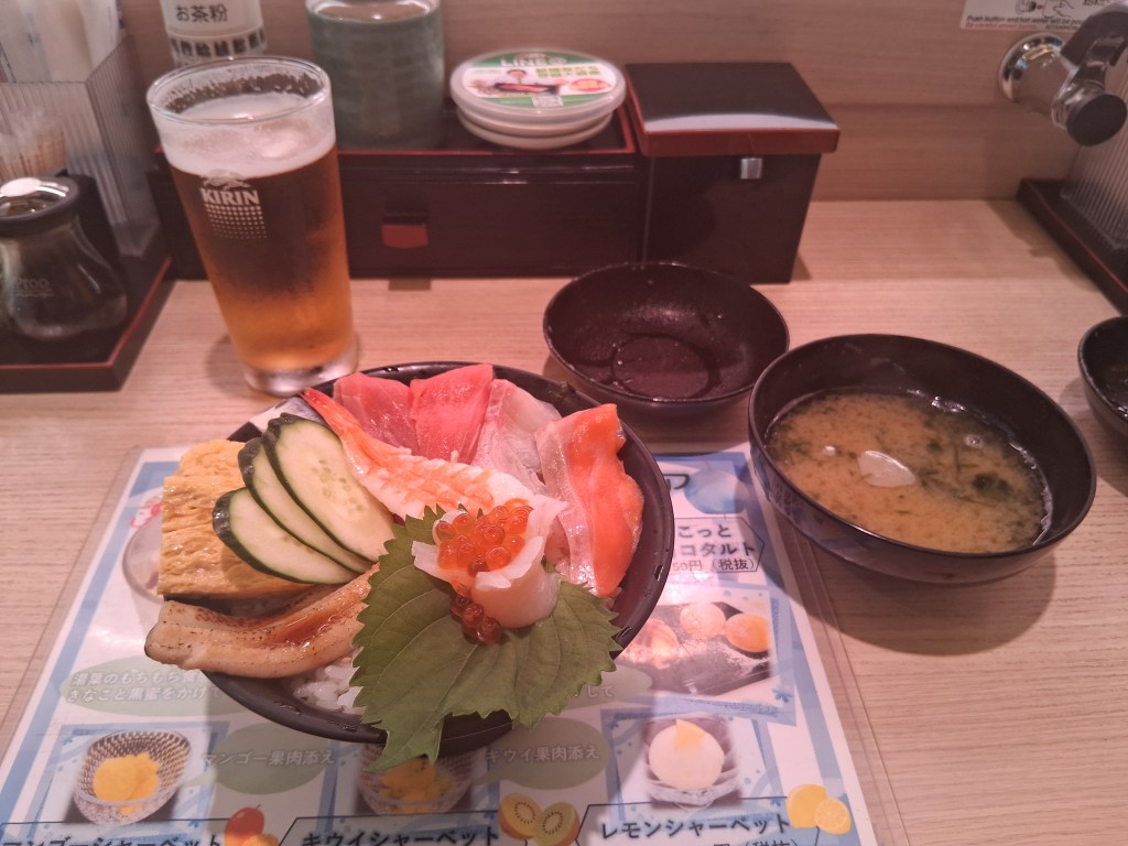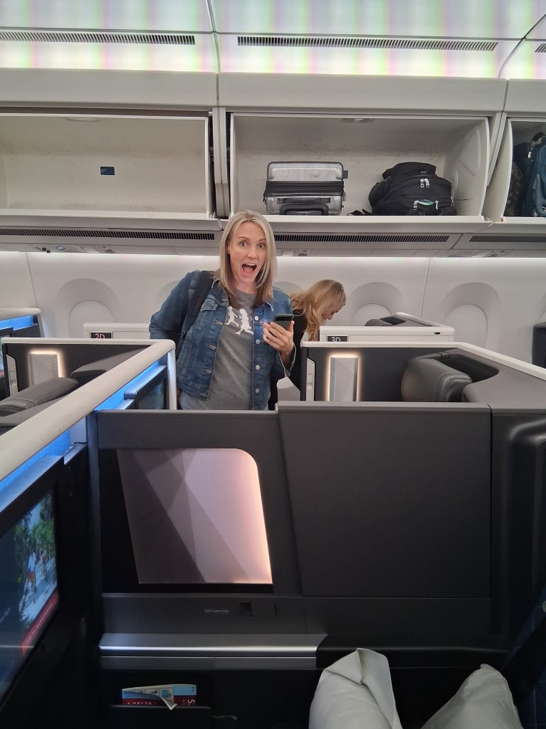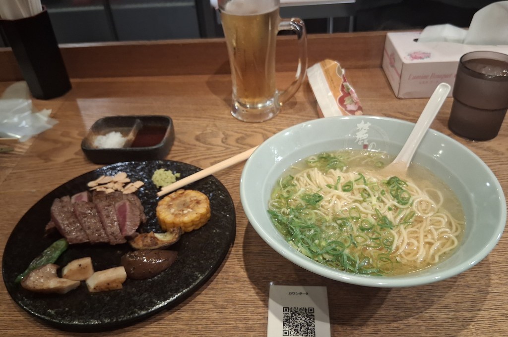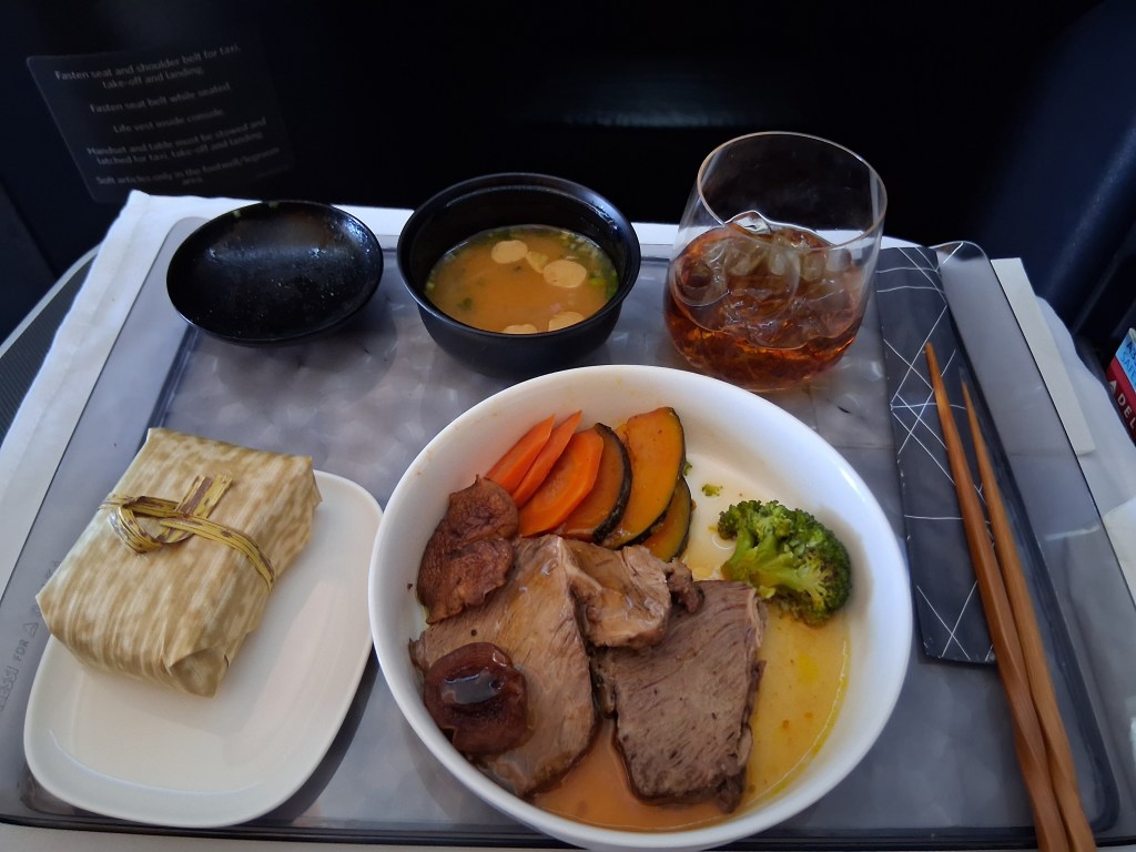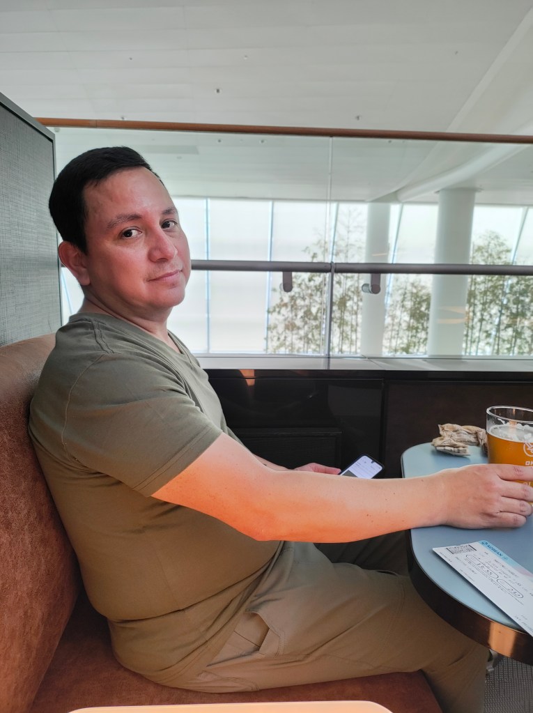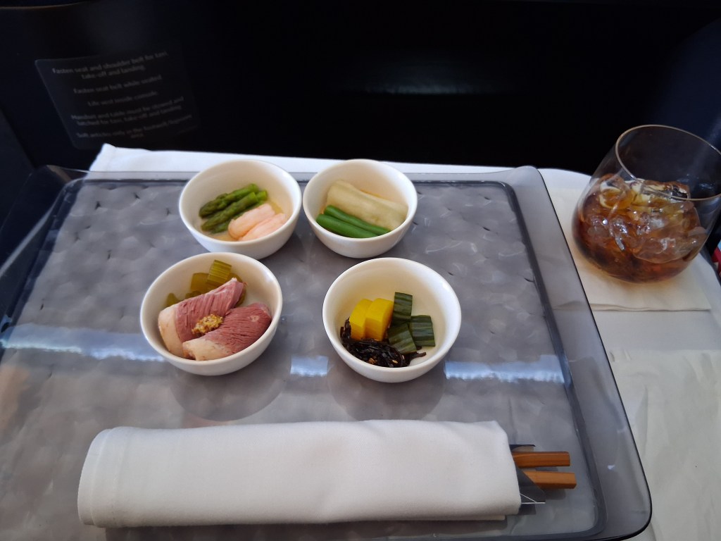 Tues, Sept 9 – Day 2 – First Class & Delta One Class – Bob and Norma drove us to the airport EARLY to catch our 5 am flight. In domestic First Class, Bobby kept it real by enjoying cereal (Special K) with a mimosa for breakfast. During our layover in Seattle, we visited the newly-opened Delta One Lounge. It was quite swanky. [It’s advertised as “an exclusive airport lounge for Delta One business class passengers and eligible Delta 360 members offering a premium, private experience with amenities like full-service dining, spa treatments, shower suites, and attentive service.”] After breakfast and a beverage, we headed over to our gate. Boarding international Delta One Class is basically like having your own cubicle, with a door, and a bed, on a plane. We ate, drank, watched movies [Jaws – it still totally holds up], and slept in (mostly) comfort on our way to Japan.