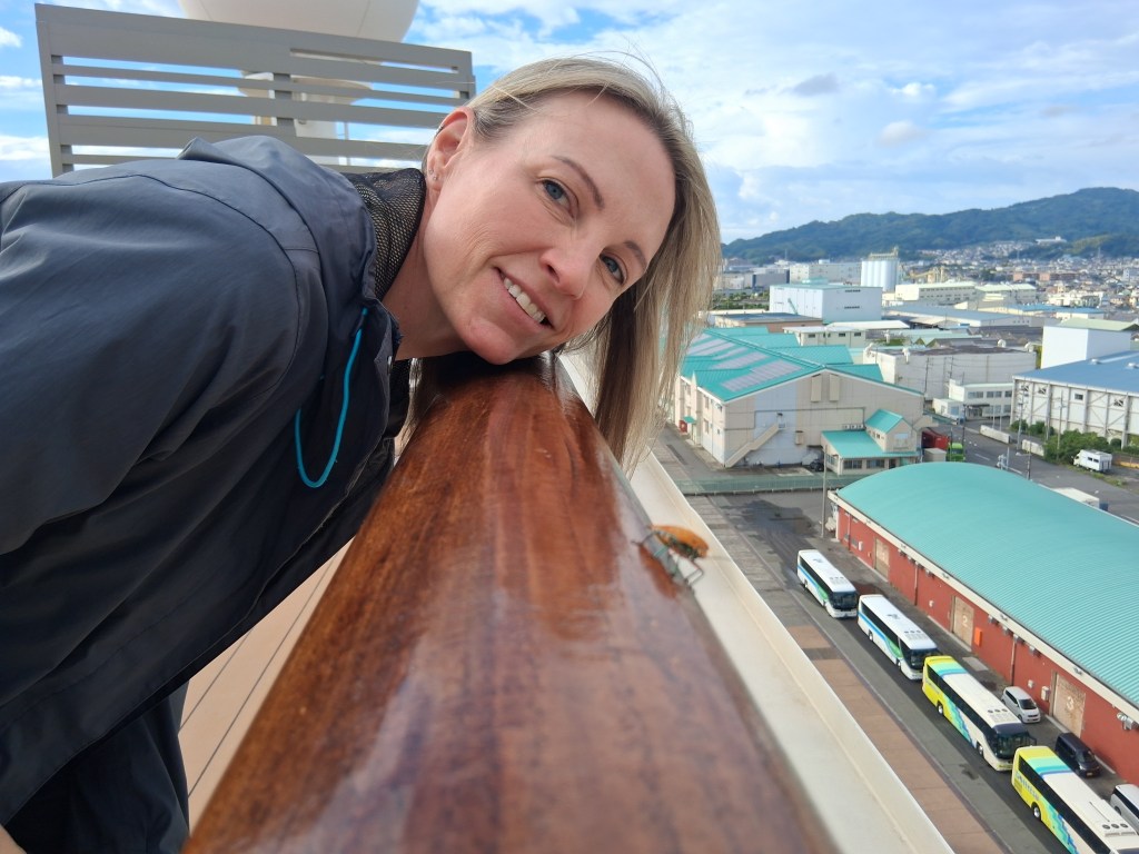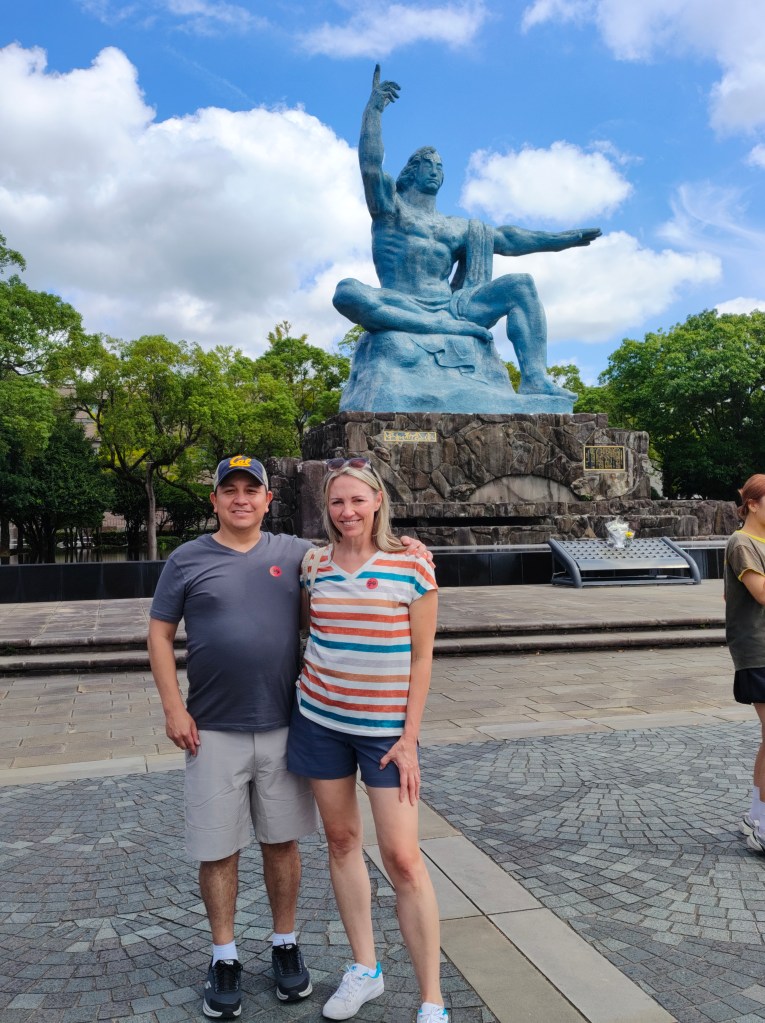 Fri, Sept 19 – Day 11 – Nagasaki. Once again, Bobby wakes up to Nicki yelling for him to come out onto the balcony. This time she’s right – Nagasaki is the most scenic port we’ve seen so far, by far. We cashed in on our newly-rescheduled, climate-controlled bus tour (hooray!), and enjoyed a motorized, panoramic view of Nagasaki Bay from nearby Mount Inasa. From there, we visited the Peace Statue at Nagasaki Peace Park. Very solemn – understandably, Nagasaki’s whole message is one of peace. At the memorial, school children apparently on a field trip quietly sang at the foot of the giant statue, recited speeches, and delivered colorful banners up onto the altars. Passing by, several politely said “hello” to us westerners. In tribute, visitors left bottled water beside memorials that had been gifted by foreign countries. Nicki found a postcard to send to her flaky niece Madeline – the lady in the office upstairs licked her big ledger and sold us a stamp. Then we needed to eat, so we happened upon a food court close by. Bobby had the spicy champon ramen, and Nicki ordered some sort of crispy noodles with shrimp and veggies. Oishii! Back on the boat, we enjoyed a meal at the specialty restaurant (“Sushi on 5”), which happened to be serving an Indian menu this night. We ate too much, and Nicki grumbled that her clothes were starting to feel tight (diet time when we get home!). We saw our friend Kristine again on the back deck; she played Radiohead, Bob Dylan, and Pearl Jam. Saw big green winged beetles.