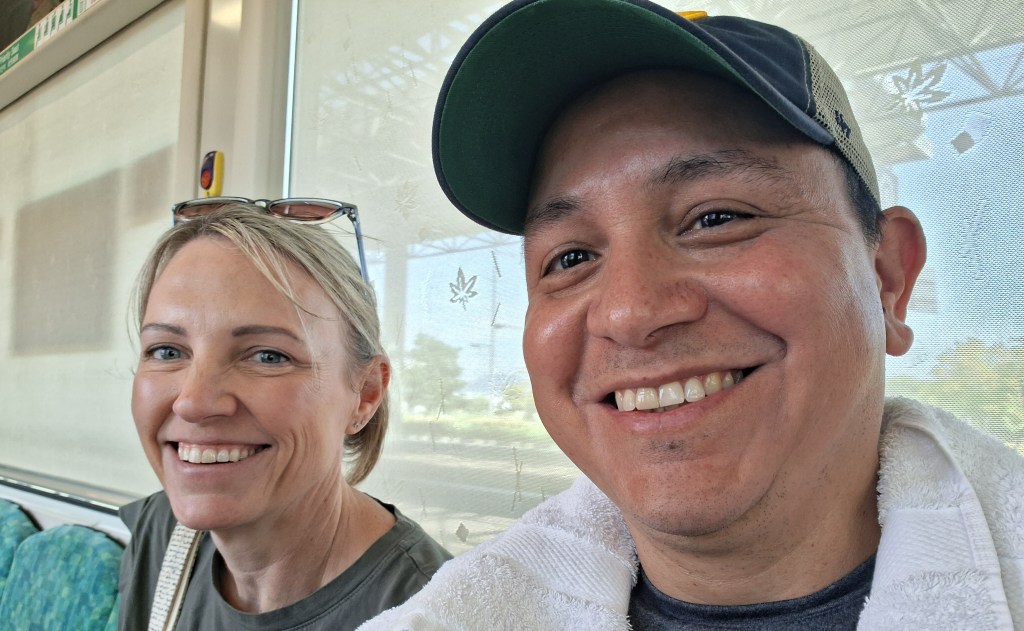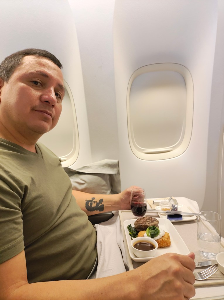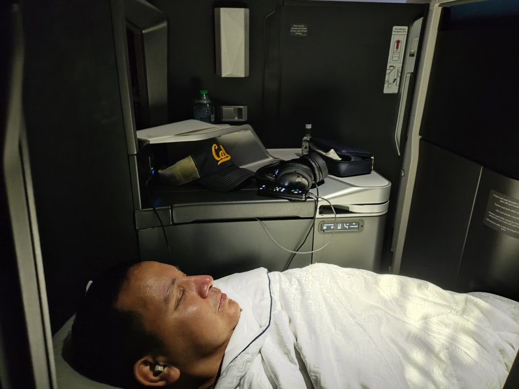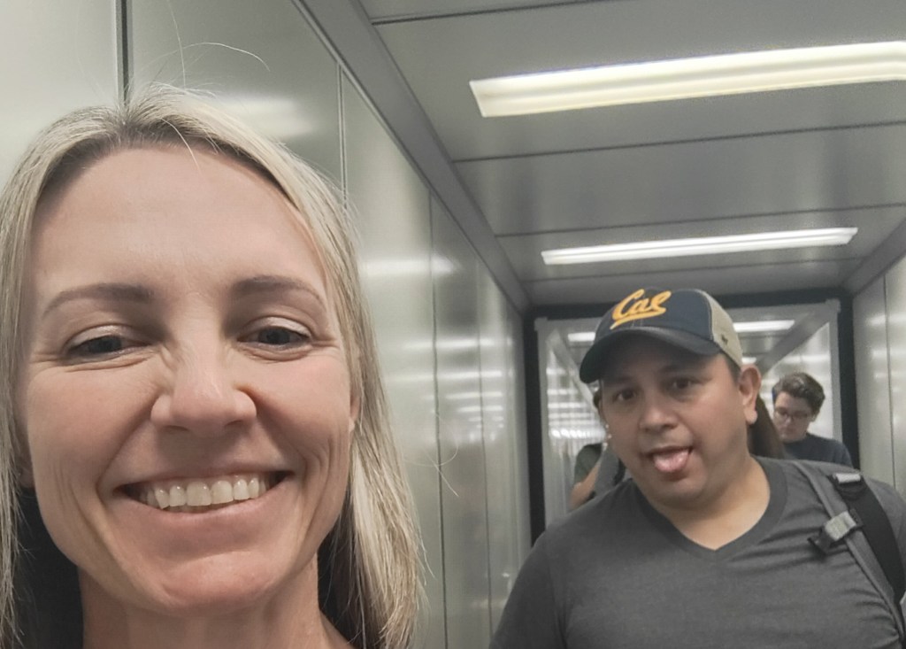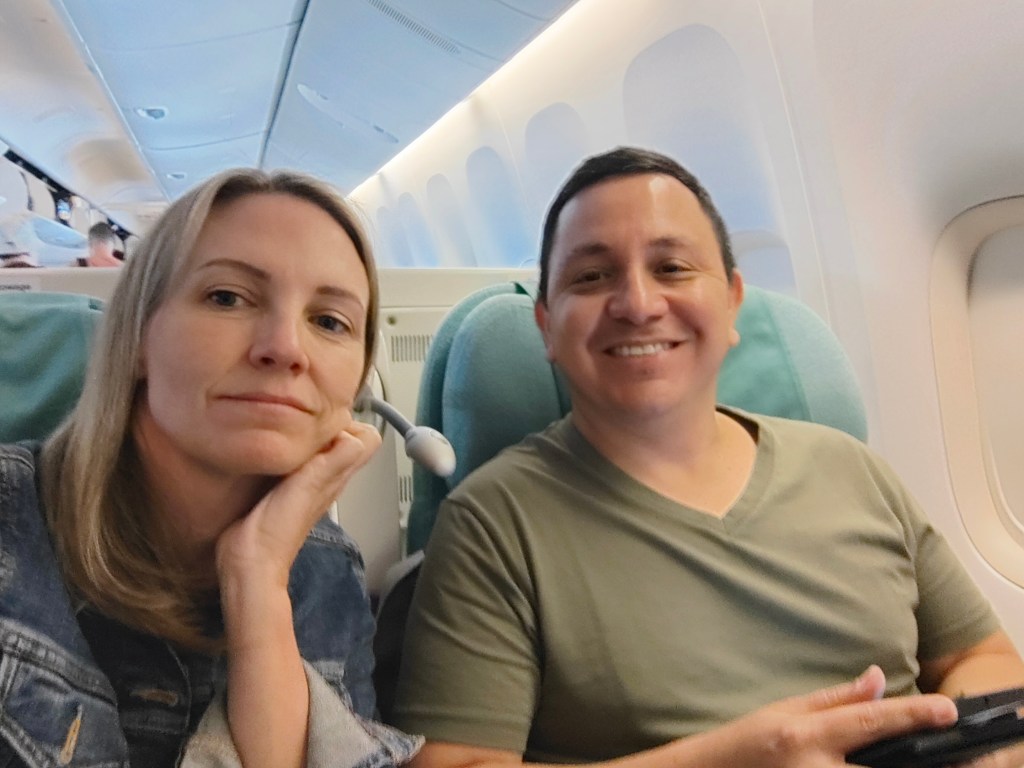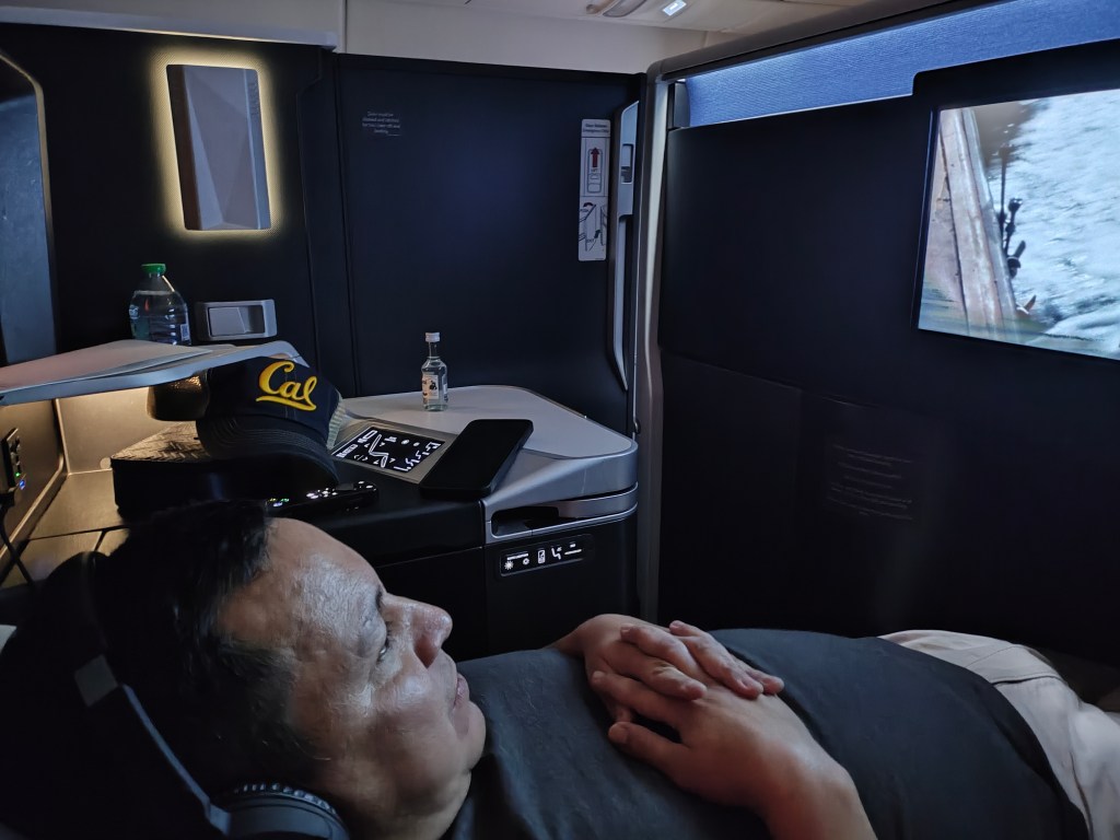 Tues, Sept 22 – Day 15 – Seoul & the longest Tuesday ever. We had to be off the ship by 7:30 am, so we loaded up and caught an early cab to Incheon Airport. Bobby was very over the disembarkation process, but he rallied. The upside is that when we got to the airport, we had access to the Korean Air VIP lounge, and he was able to take a shower with top-notch amenities! [The amenities were superb]. The flight back to LAX was nice, with food and drink and fully-flat reclining seats, so we were able to sleep. Bobby fully endorses Korean Airlines. We had a layover in another Delta One Lounge at LAX, followed by a short flight to Sacramento and our wonderful cats. Weirdly, we left Seoul at 2:30 pm on Tuesday afternoon, yet arrived in Sacramento at 1:30 pm, earlier the same day: time travel! Ever the rock star, Nicki fell asleep sitting up at 7 pm that evening. Nicki and Bobby both slept for about 15 hours that night.