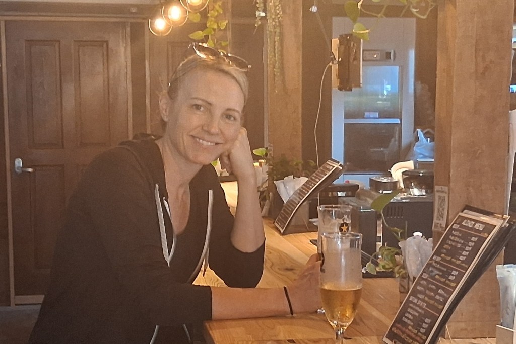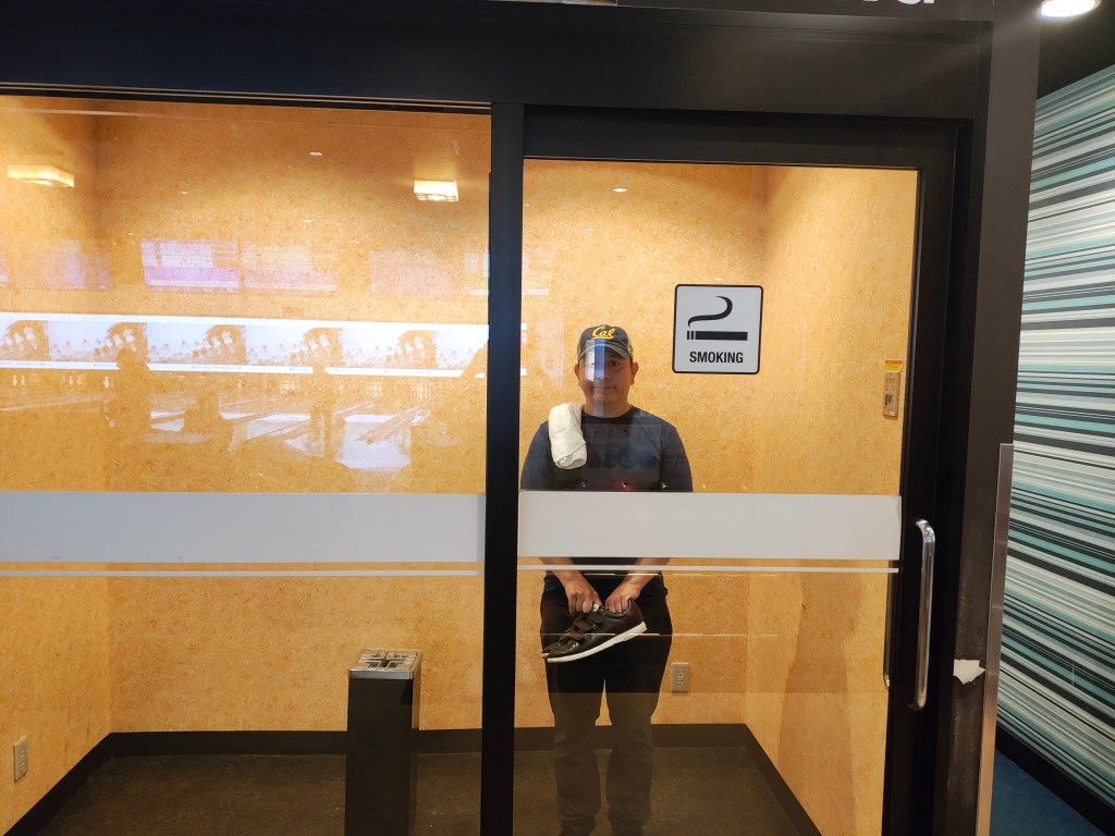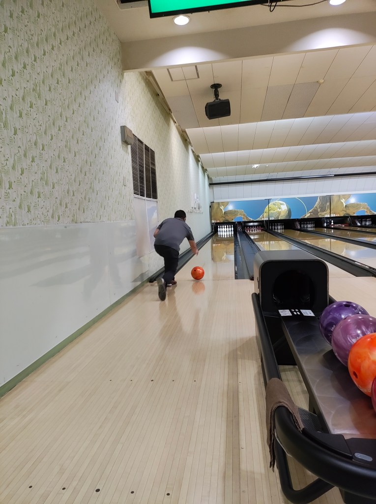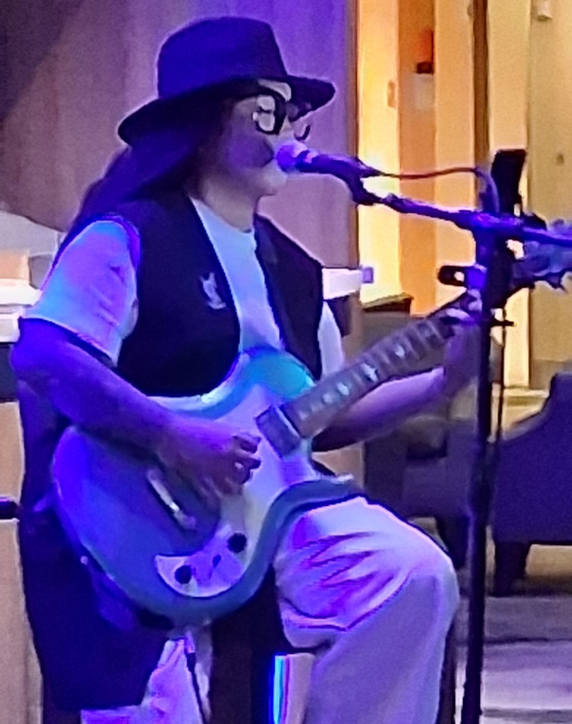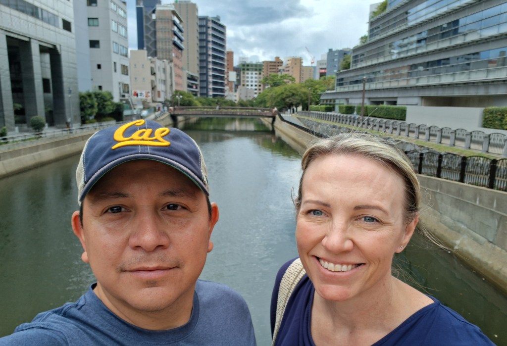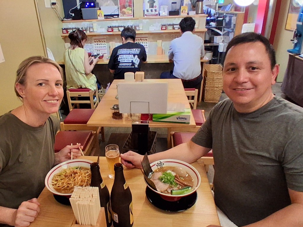 Tues, Sept 16 – Day 8 – Hiroshima. To honor the setting, we went bowling, again! This time we took a streetcar downtown to Hiroshima Park Lanes in Naka Ward. Just for fun, there happened to be a Dodgers/Phillies game on TV. Everyone stopped to watch Shohei Ohtani bat. Bobby did much better this time, so we happily headed to a ramen shop around the corner, where we met “banana socks” Steve and Wendy from Florida, who were also from the cruise ship. This was a little weird, because we thought we were way off the beaten path, but they were cool (although they both wore oversized black bibs that looked like bulletproof vests to ward off splashy ramen broth). Nicki ordered the leek ramen, which she says was delicious but very pungent. The dragon breath was worth it. We returned to the ship and found our new favorite musician, a solo guitarist named Kristine who had a cool raspy voice. Bobby was enamored of her guitar [A PRS Starla SE] and quickly made friends. Too full from ramen for dinner with Ricky and Cindy – oh well.