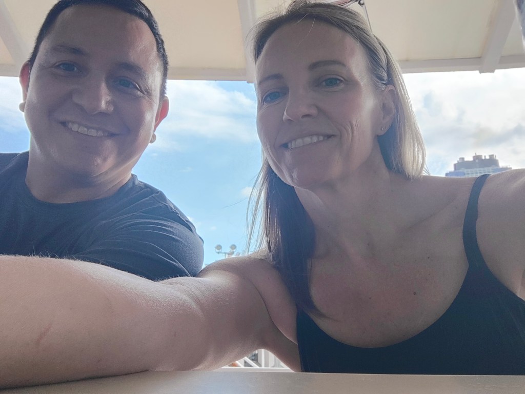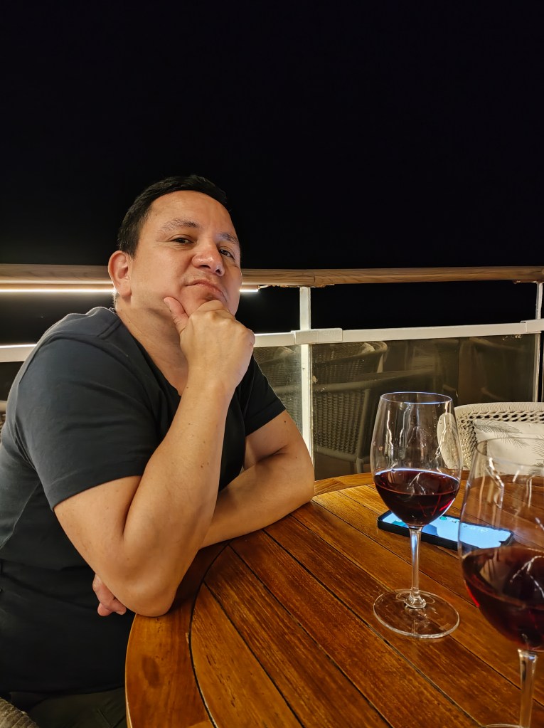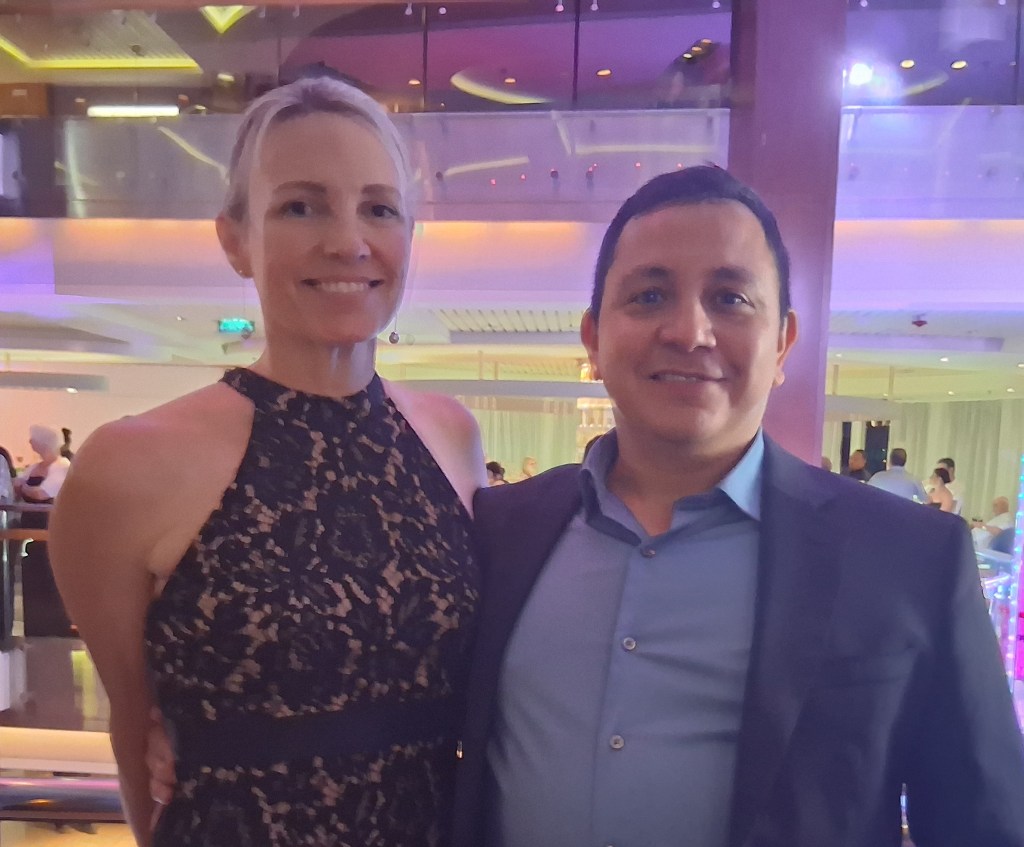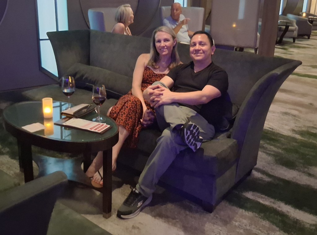 Wed, Sept 17 – Day 9 – A Day At Sea. We ate breakfast in the dining room for a change: quiche, omelets, and coffee/mimosas. Très classy! But also fun; we got to sit in the tall shell chairs that blocked the view of the foot traffic. Afterwards, we played Deal or No Deal and bingo in the Sky Lounge. We won nothing! A mother/daughter team (Samantha C. and her ma) from Florida happened to win both games (shady), walking away with almost $950. Rigged game! Nonplussed, we played music trivia next, which Bobby normally wins (but now says he lost because it was all corny music, i.e. The Vengaboys). Again, dinner with Ricky and Cindy. Ricky insists that he’s the first person off the ship every morning. Cindy acts normal and smiles.