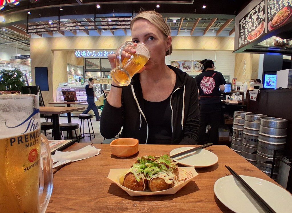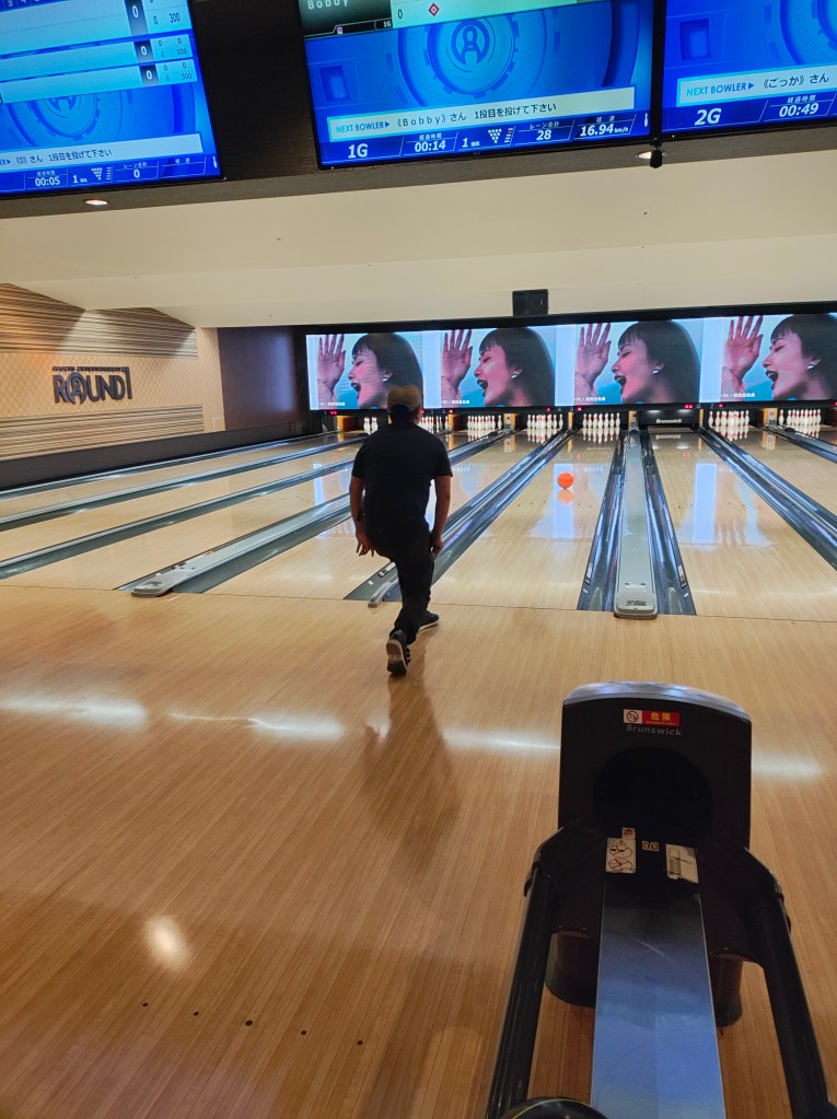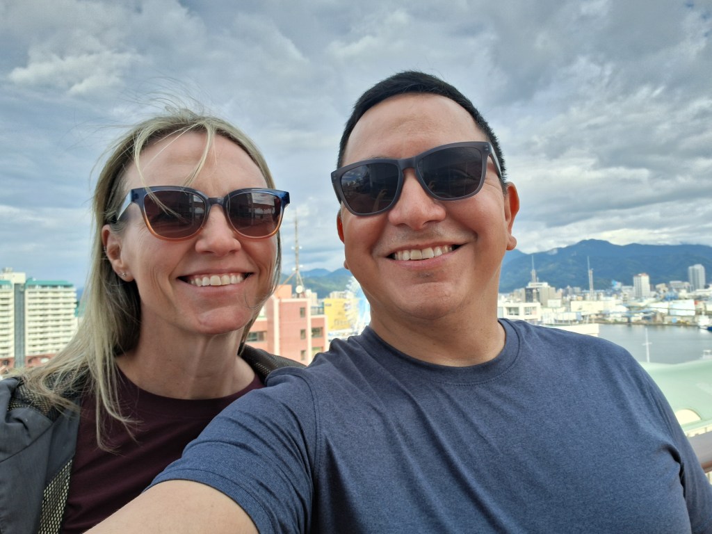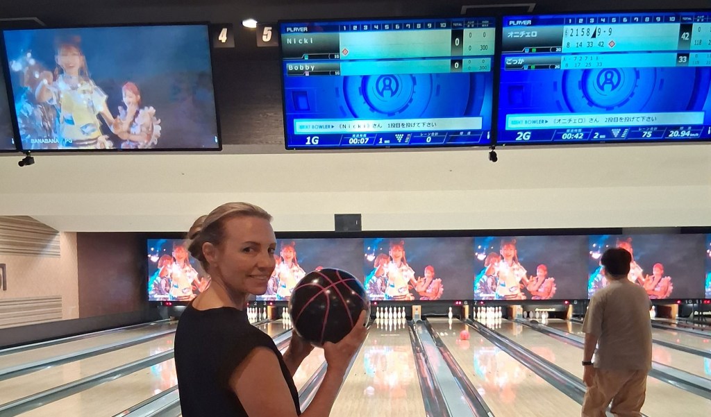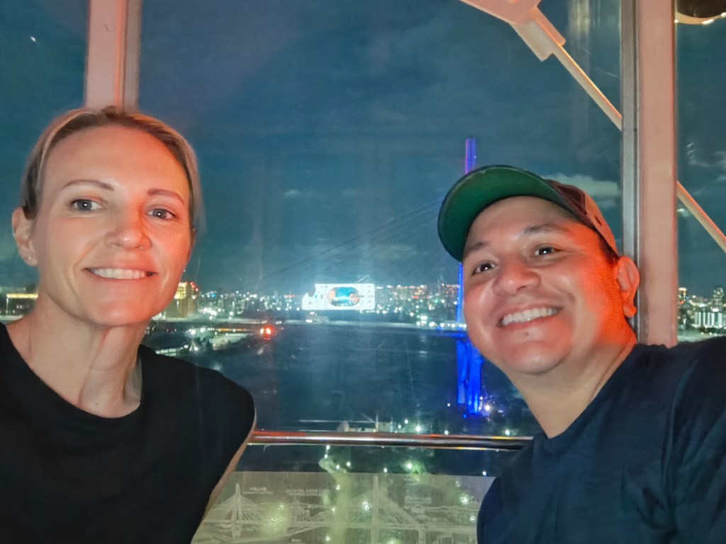 Sat, Sept 13 – Day 6 – Osaka. The Japanese are just like us – we both like bowling! We jumped ship, found our way downtown, and came across Round 1 Stadium Sennichimae. It took a minute to get the hang of things, but the Japanese lessons are starting to come in handy, as cell service (i.e., Google Translate) is patchy and nothing’s in English. Fortunately for us Americans, a lot of the signage is image-driven. After speaking to a helpful, mostly-bilingual attendant, Nicki managed to reserve a lane, and we pulled our rental shoes from a vending machine, which was amusing. After three games (in which Bobby did poorly), we explored the Namba neighborhood, where we ate ramen with Kobe beef and giant shrimp (excellent), and bought some birthday gifts for our friend Bryan. We found a bar, met a couple from New York, and once again headed back to port, this time in time to ride the 112-meter Tempozan Ferris Wheel. (The Japanese enjoy their Ferris wheels, and this one is the tallest in the country).
