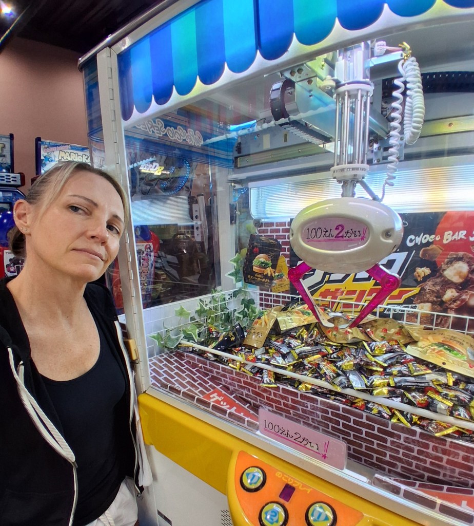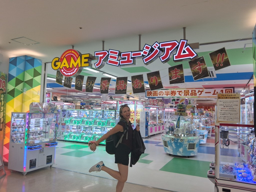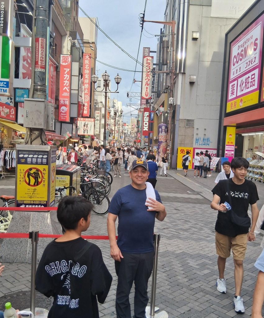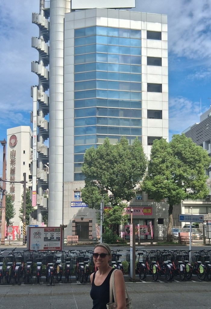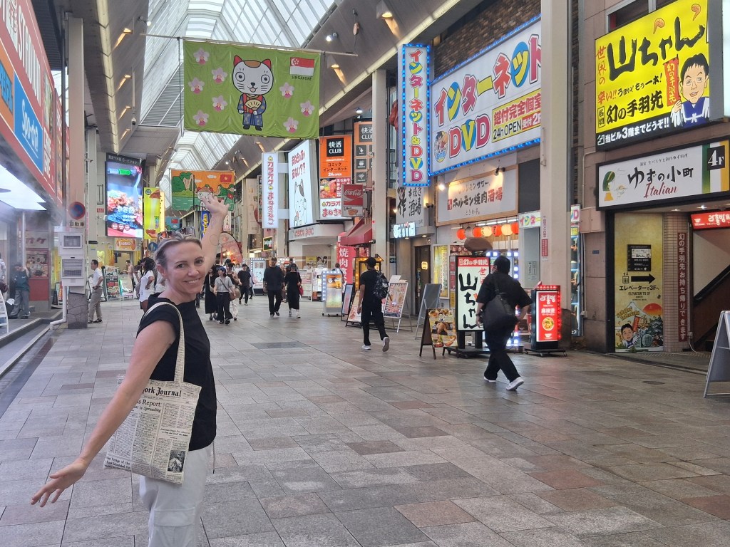 Sat, Sept 13 – Day 6 – Osaka. The Japanese are just like us – we both like bowling! We jumped ship, found our way downtown, and came across Round 1 Stadium Sennichimae. It took a minute to get the hang of things, but the Japanese lessons are starting to come in handy, as cell service (i.e., Google Translate) is patchy and nothing’s in English. Fortunately for us Americans, a lot of the signage is image-driven. After speaking to a helpful, mostly-bilingual attendant, Nicki managed to reserve a lane, and we pulled our rental shoes from a vending machine, which was amusing. After three games (in which Bobby did poorly), we explored the Namba neighborhood, where we ate ramen with Kobe beef and giant shrimp (excellent), and bought some birthday gifts for our friend Bryan. We found a bar, met a couple from New York, and once again headed back to port, this time in time to ride the 112-meter Tempozan Ferris Wheel. (The Japanese enjoy their Ferris wheels, and this one is the tallest in the country).