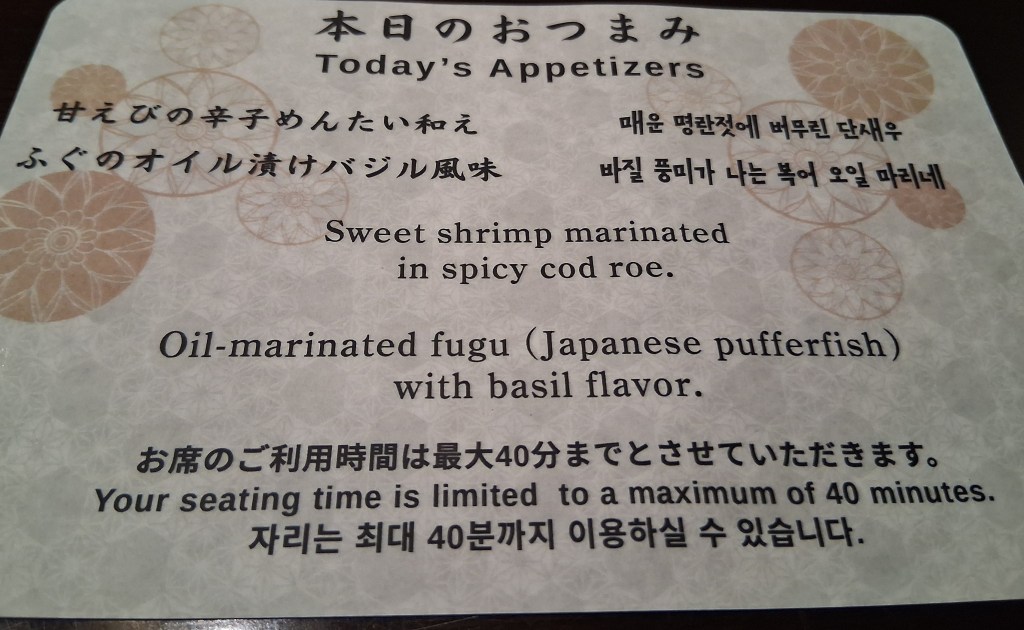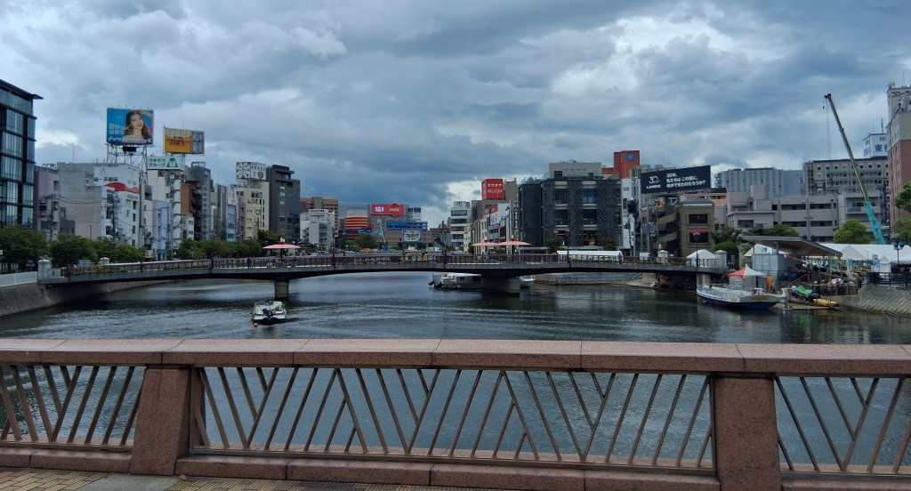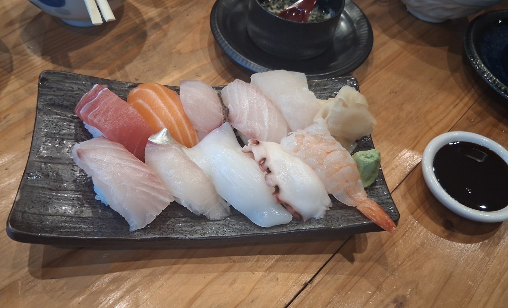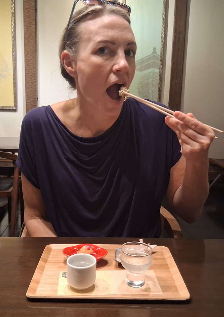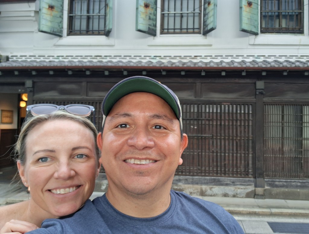 Sat, Sept 20 – Day 12 – Fukuoka. Our usual, we hopped the shuttle downtown and walked around the city. It was still humid, but not quite as hot. We crossed a couple rivers, caught a cab, and made our way to Ishikura Sake Brewery in Hakata Ward, where we sampled several different sakes and ordered some appetizers: shrimp with roe and puffer fish! (It’s amusing that a brewery founded in 1870 has a framed photo of the Rolling Stones in the bathroom.) We then continued our walking tour, despite the rain (a nice change of pace) and found a spot for lunch. Bobby had the sushi lunch and Nicki had seared tuna cheek. That afternoon, as we were leaving port, schoolkids performed music for our departing ship and unfurled a banner that said “See You Soon in Nagasaki.” Their version of “We Are The World” had everyone on the ship waving their arms like a power ballad. We took a little downtime and watched a movie (Big), and sought out Kristine’s music for the evening. Again, too full for dinner with our Ricky and what’s-her-name.