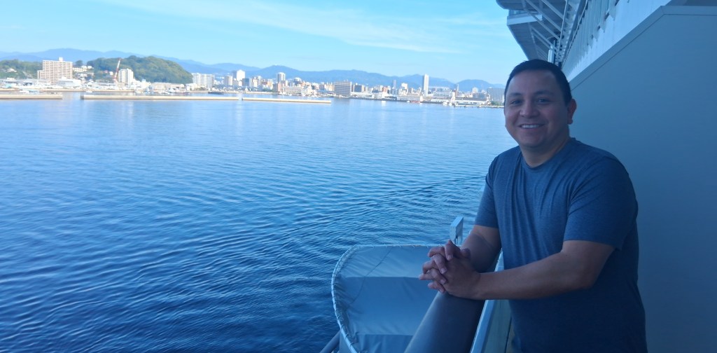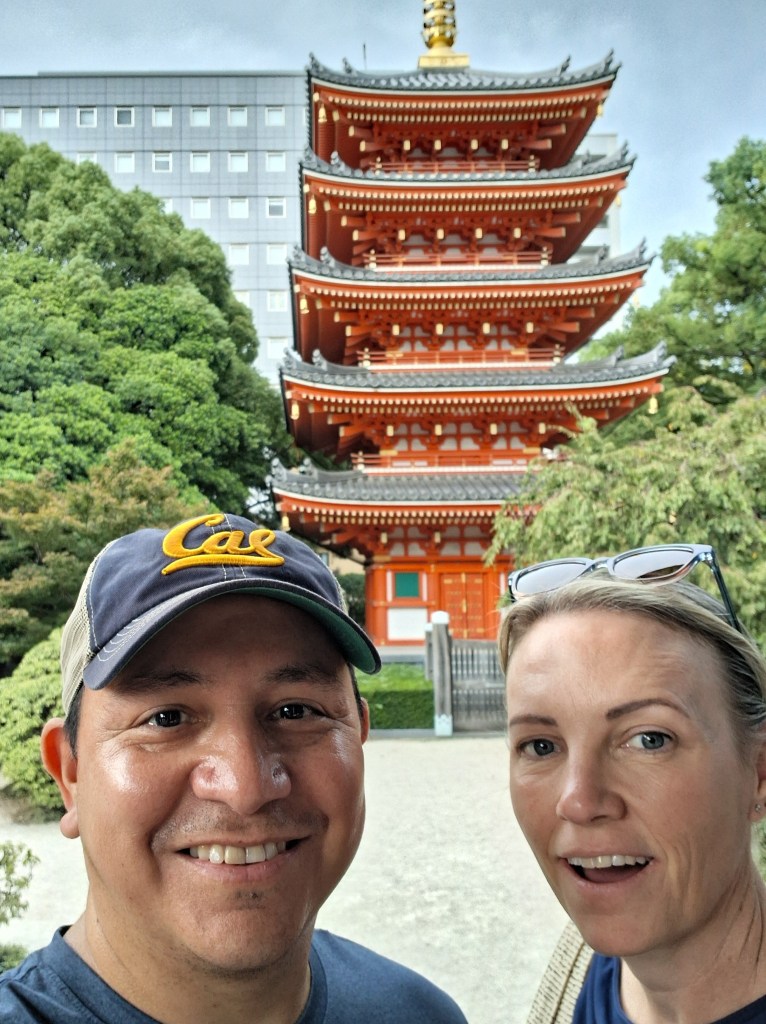 Fri, Sept 12 – Day 5 – Shimizu Port (Mt. Fuji). It was overcast, so no one could see Mt Fuji, but then, we were told that there’s really no snow at the top of the mountain at this time of year, so who really needs to see it anyway? Instead, we explored the neighborhood around the port, including a generously air-conditioned 7-11 and a couple of very old temples. One of the temples was built in the 17th century (!) after a tsunami damaged the city center. The whole site is an offering to the water gods. Also, this is apparently Japan’s HOTTEST SUMMER ON RECORD (of course), and wouldn’t you know it, 96% humidity makes ice cream melt even faster, which we found out the hard way. We returned to port all sticky. Later that afternoon, back on the ship, we enjoyed some pool time, played some trivia, and won corny medals for getting 20 out of 20 in a “name the missing word in the series” type-game. We dressed up all snazzy, enjoyed a formal dinner, and watched The Soundtrack Band (catchy name) play cruise-style pop hits.