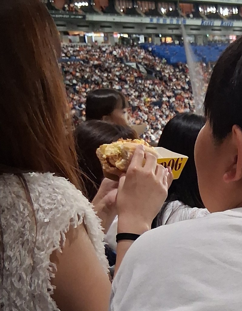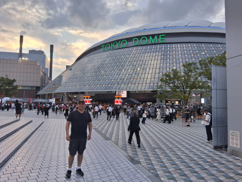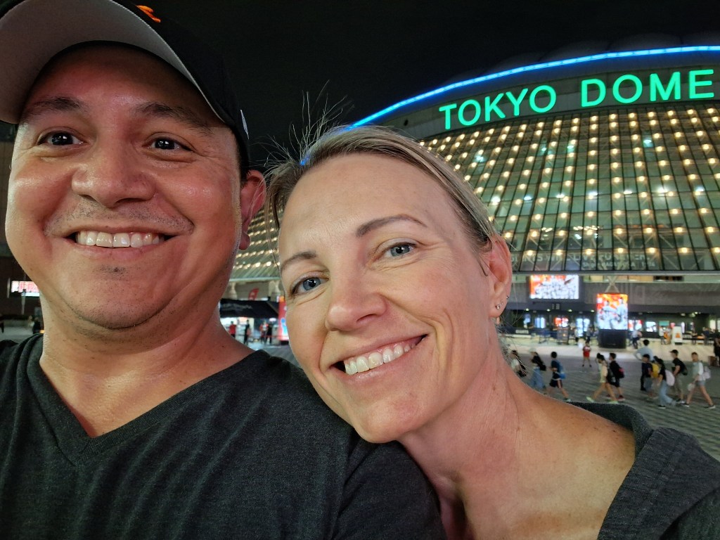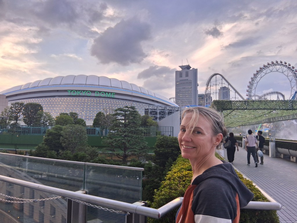 Wed, Sept 10 – Day 3 – Tokyo! The night before our cruise, we stayed at the Tokyo Dome Hotel (36th floor). We arrived around 4 pm local time, then headed over to the actual Tokyo Dome to see the Yomiuri Giants play the Hiroshima Toyo Carp. [Very exciting if you’re at all interested in Sadaharu Oh]. Japanese baseball is like Major League baseball, only more so. More singing, more chanting, and much more interactive! The beer girls carry mini-keg backpacks and fill your beer at your seat! Also, WE GOT ON THE JUMBOTRON, 100% point blank! We waved like idiots. The Giants won 4-3 in the bottom of 9th, Bobby found a new cap, and speaking of caps, we enjoyed a nightcap on the 43rd floor of the hotel.