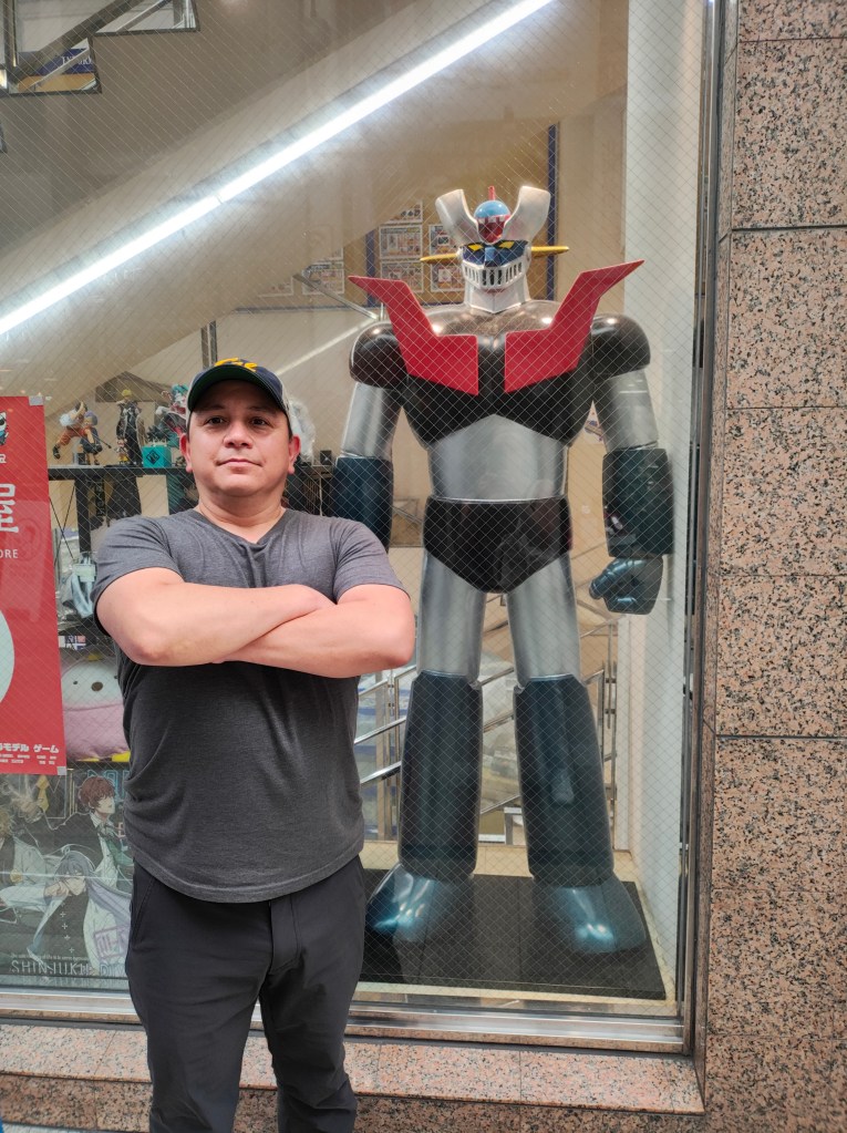 Thurs, Sept 18 – Day 10 – Yagoshima. The shuttle took us to Dolphin Port, so we found a pool hall nearby and decided to shoot some stick (Japan, you’re the best). A shaded (yay!) marketplace was nearby, so Bobby took some photos with E.T. and whatever a Shogun Warrior is. We came across a restaurant serving takoyaki – lightly-fried balls of dough with octopus, pickled ginger, and green onion inside. They were really good – and did we mention that Nicki temporarily renounced her vegetarianism on this trip? For actual lunch, we chose a place that served its food via conveyor belt, which was new for us. After paying, Nicki complimented that the meal was oishii (meaning “delicious”), and the employee stepped outside with us and bowed as we left. Too full for dinner with our Royal friends. We saw an acrobatic show instead.